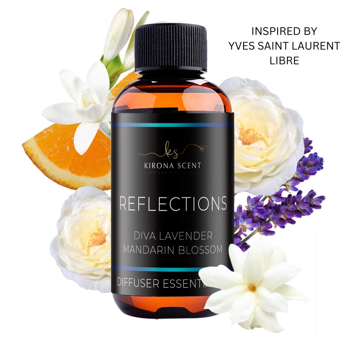 Reflections is a scent that is inspired by Yves Saint Laurent's Libre. It embodies a harmonious fusion of aromatic lavender, refreshing citrus and rich vanilla, creating a scent profile that encapsulates the essence of a free spirit.