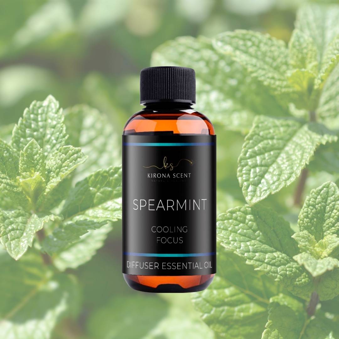 Spearmint essential oil is a refreshing, cool and minty scent that is perfect for freshening up any space. Its uplifting aroma can lift one's mood and promote increased focus.